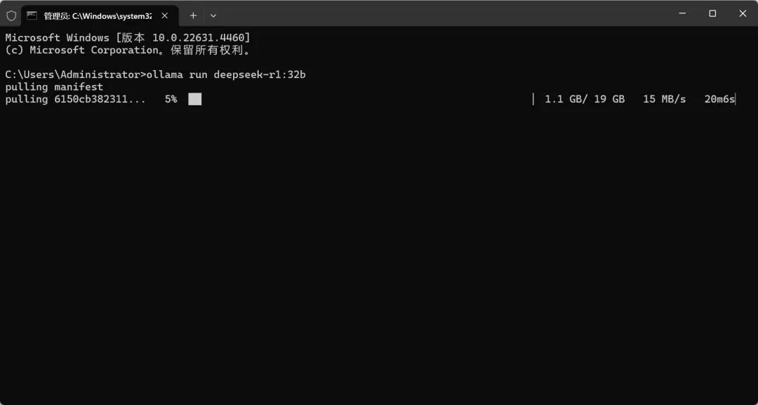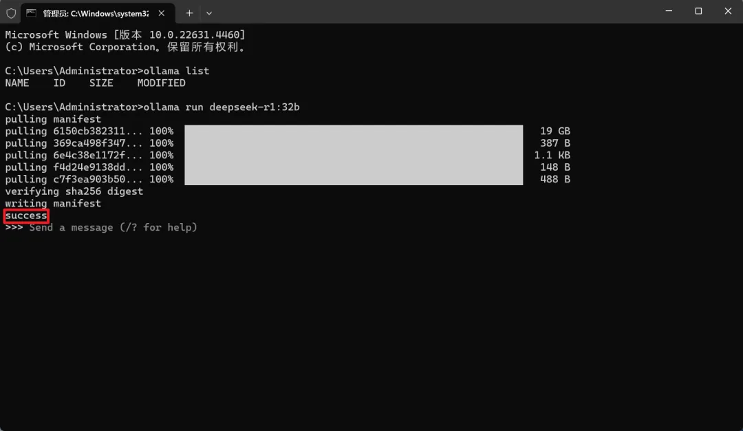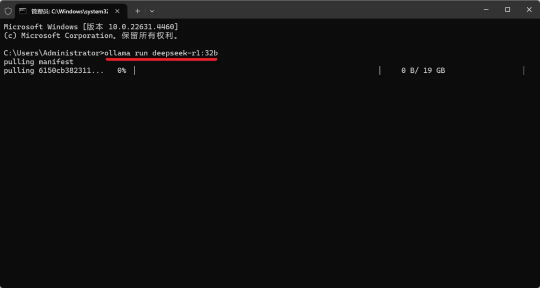 然后输入上面的那串文字“ollama run deepseek-r1:7b”,下图软妹电脑选择了32B,但事实是选择7B更好。