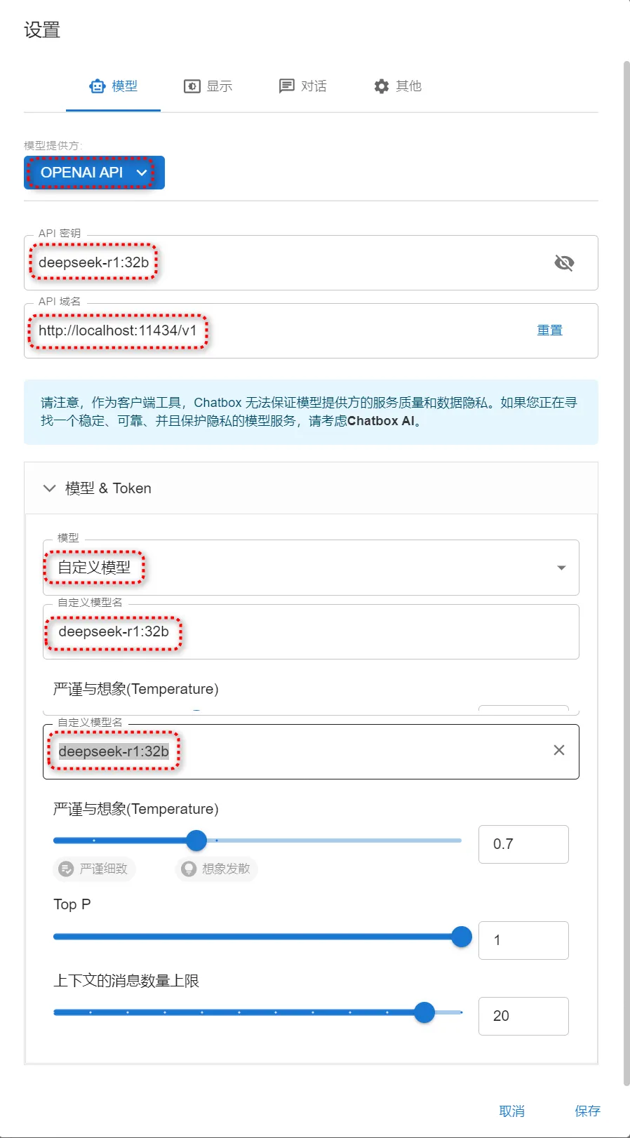 然后选择“OPENAI API”,依次填写API密钥、API域名、选择模型等等,注意我这里的是“32B”,填写的是“ollama run deepseek-r1:32b”,你们选择“7B”的要填写“ollama run deepseek-r1:7b”