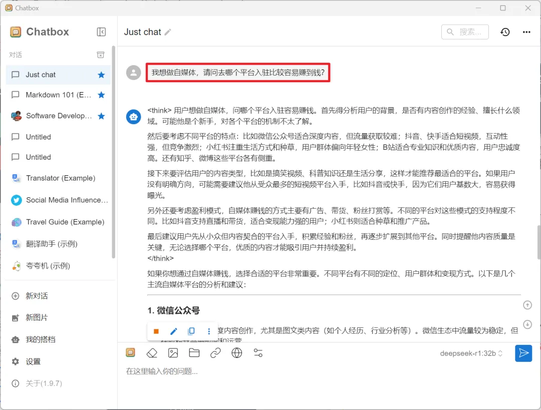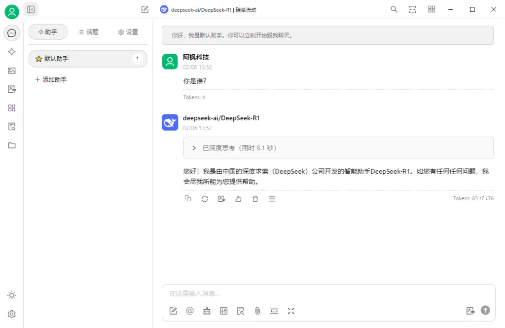 填写好后点【保存】,然后软件就可以调用DeepSeek进行对话了,输入你的问题,软件即给出你想要的答案。