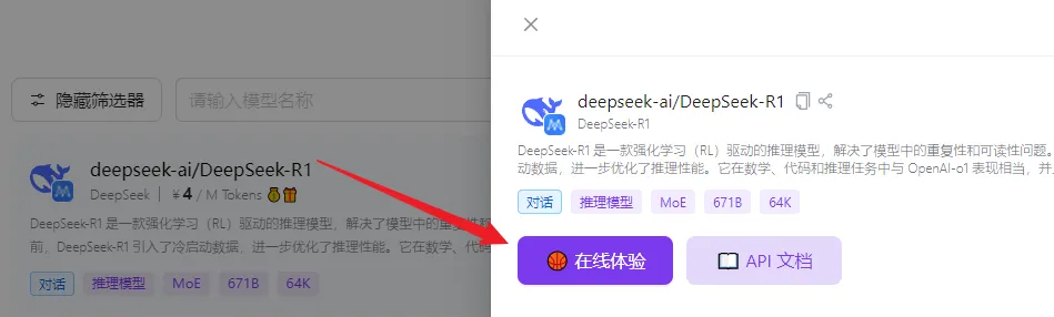 在模型广场首页有很多DeepSeek的模型,如果想要体验满血版R1,就认准这个671B的R1模型,点击“在线体验”即可使用。