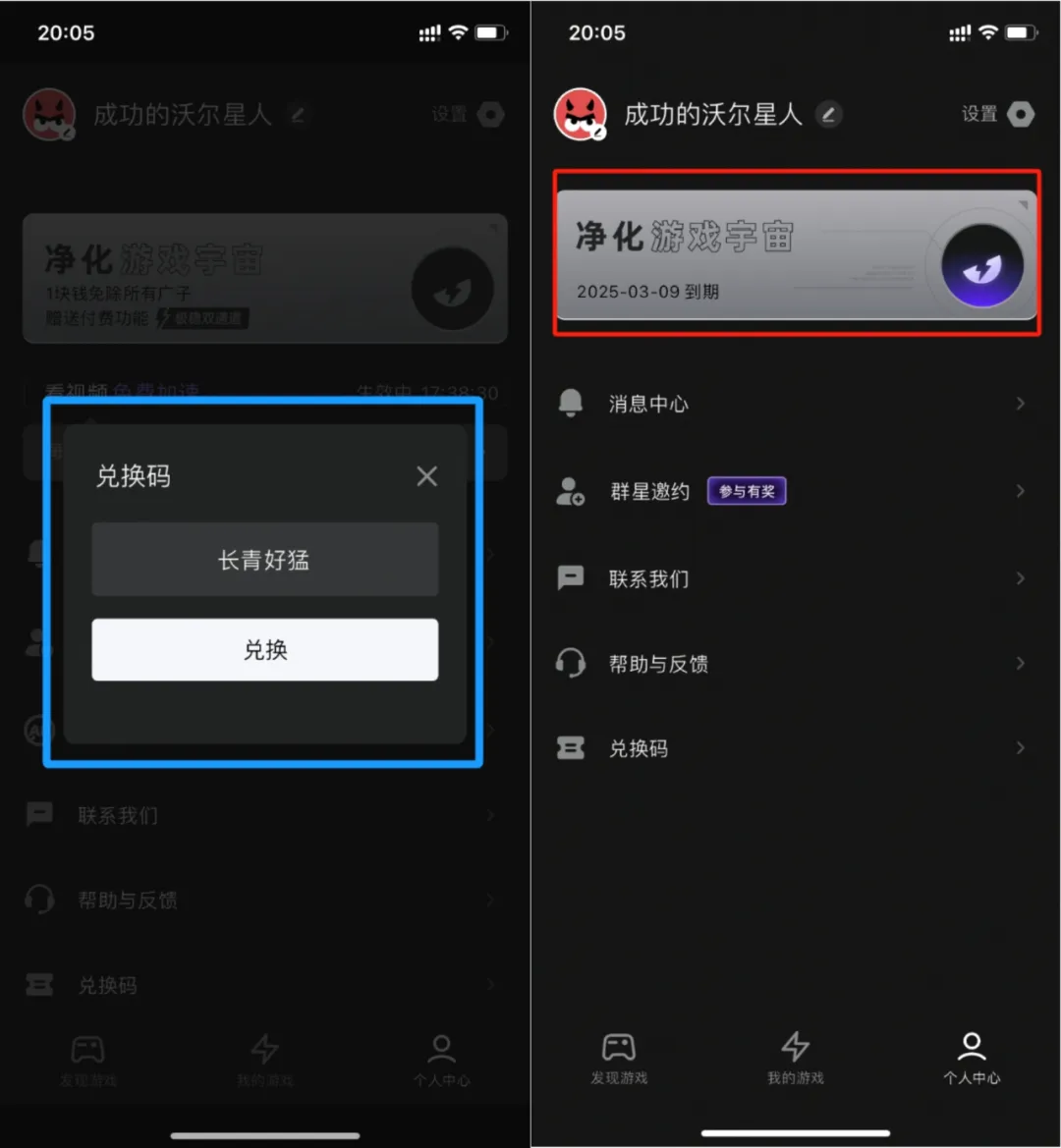 手机端在『个人中心』选择兑换码,然后输入长青专属口令,即可兑换3天VIP。