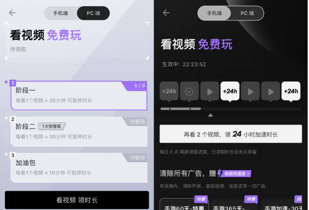 免费领取加速时长需要先下载手机版,登录账号,然后就可以去看广告领取时长了,这里加速时长是区分手机版和电脑版的。