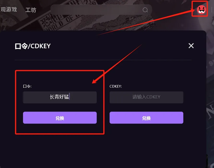 PC端点击『头像』选择『口令』,然后输入长青的专属口令,就可以兑换50小时加速时长(不可暂停)