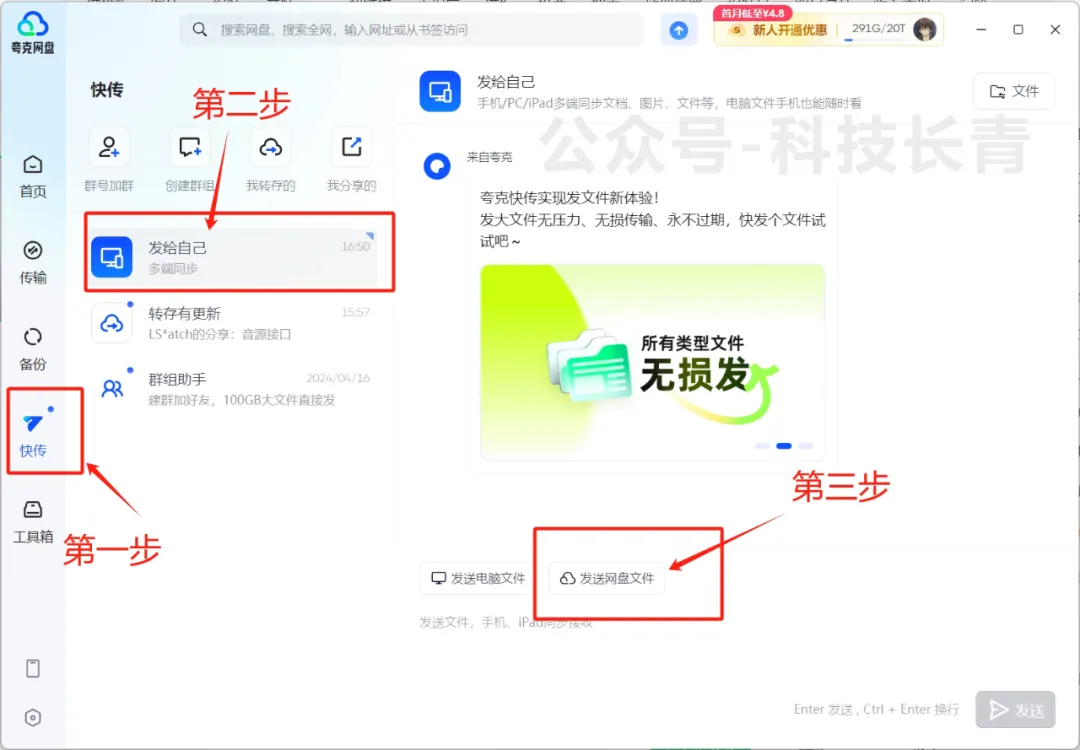 首先我们在【快传】这边,选择【发给自己】,然后选择『发送网盘文件』。