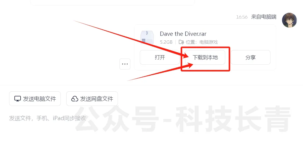 然后把自己网盘里面那个需要下载的文件发送出去,接着我们点击【下载到本地】即可。
