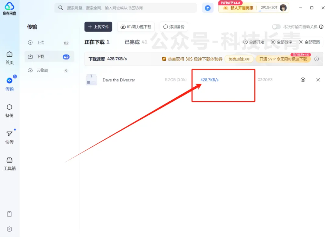 这里先看一下正常没有VIP下载的一个速度,只有几百KB,这是没有会员的正常速度。