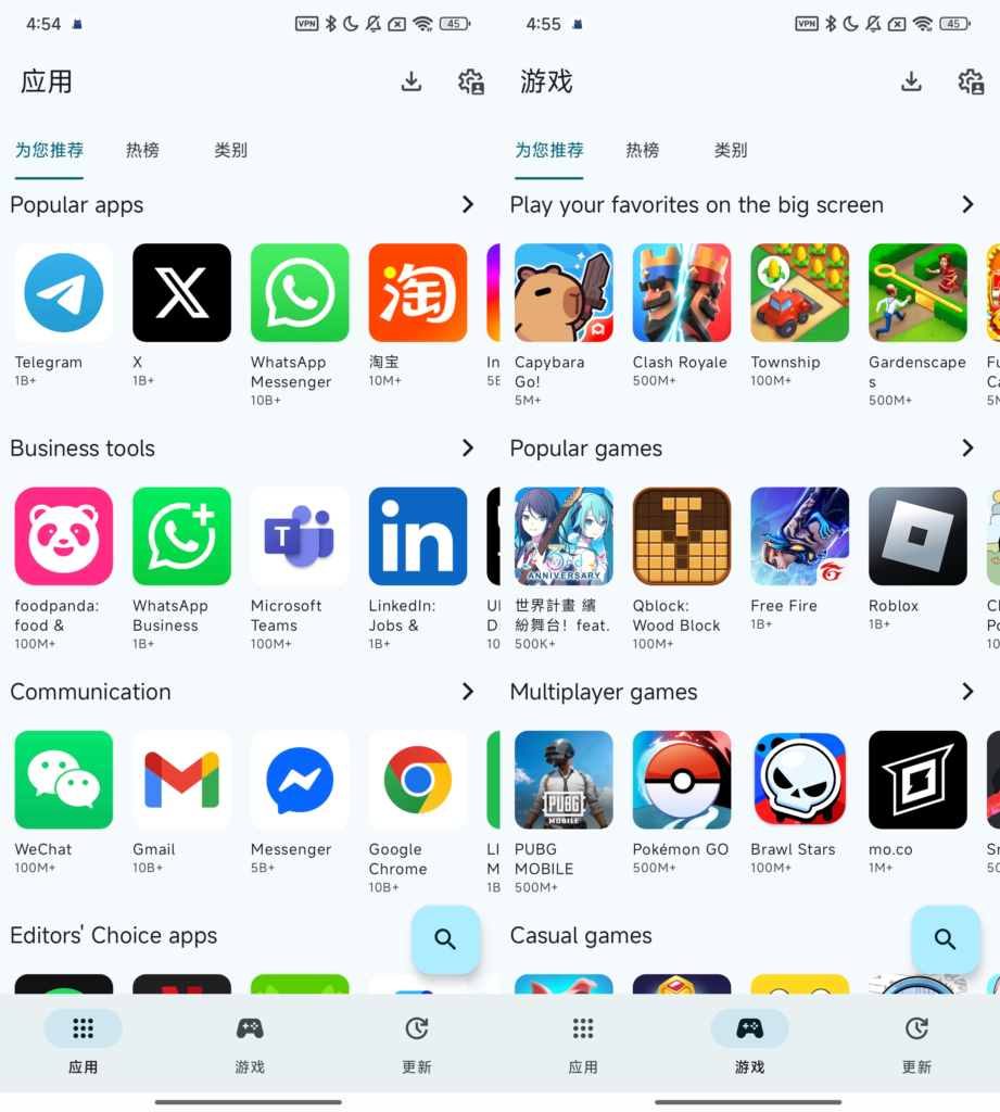 下载与更新:支持下载和更新应用程序,包括 Google Play 商店中的付费应用,部分应用可免费下载。