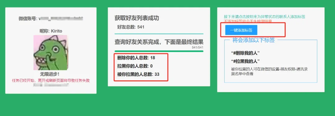 检测的速度还是很快的,长青这里500多个好友不到一分钟就检测完了。