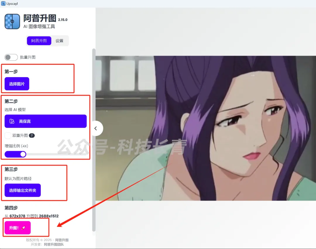 使用方法很简单,先上传图片,然后选择AI模型,选择好图片保存的路径,最后点击开始升图即可。