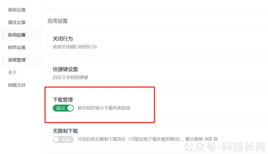 下载管理默认是隐藏的,可以在设置中开启,设置中还可以配置默认播放的音质等等。