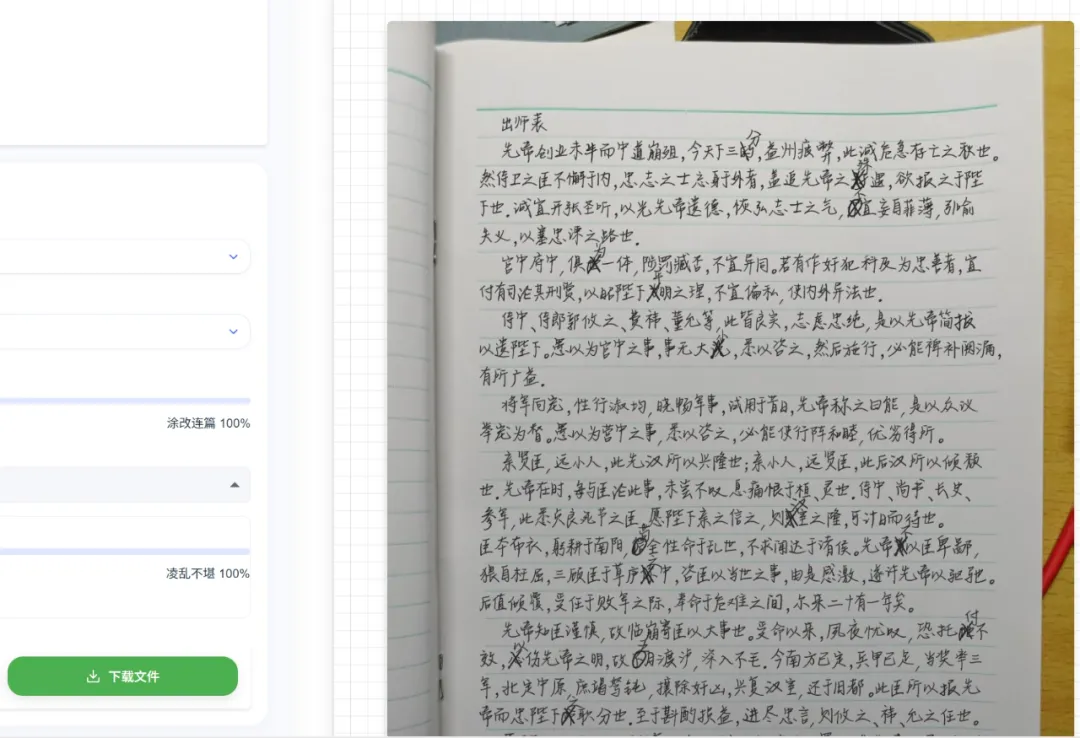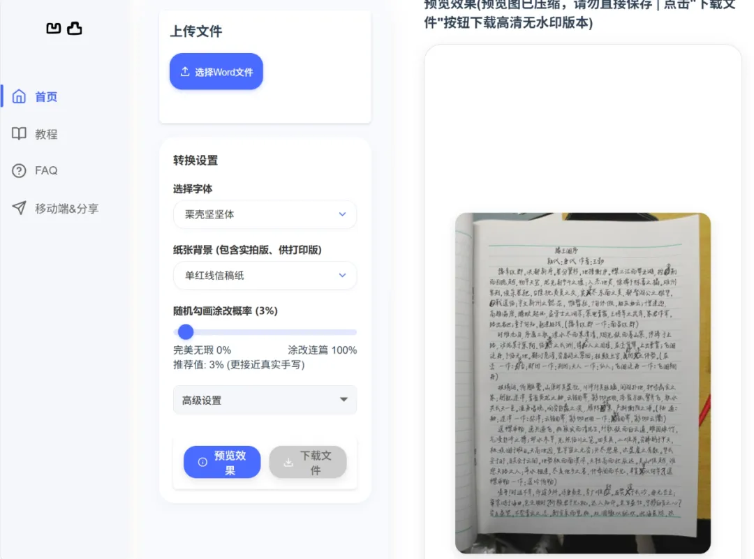 使用方法很简单,这边直接上传需要转换的word文件。然后配置一下:字体、纸张背景、涂改概率、文字凌乱程度等等,最后预览一下。