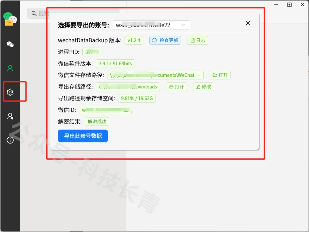 然后软件会识别我们当前登录的wx账号信息,这边我们可以点击导出按钮直接导出数据。