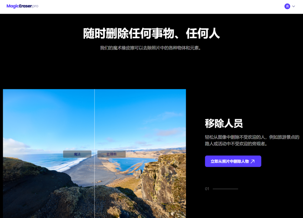 Magic Eraser是一个使用人工智能免费在线删除照片中的物体的网站,完全免费使用,可以去除图片中的任何物体和元素,注册登录之后即可不限次使用。