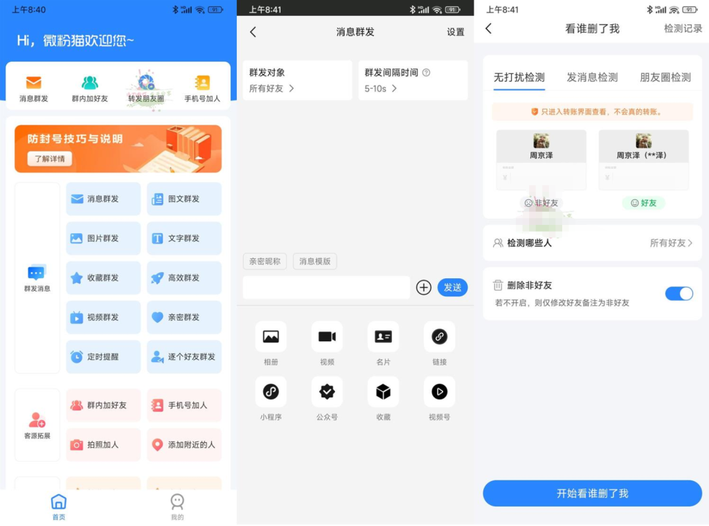 微粉猫是一款拥有海量微商工具APP。微粉猫包含群发、拓宽人脉,群发消息图片,让你群发消息推广快人一步,为微商用户提供高效稳定的服务,是一款超好用的人脉营销工具APP。